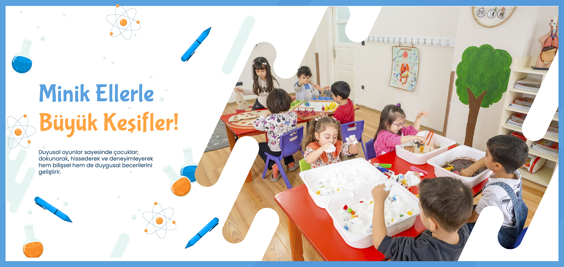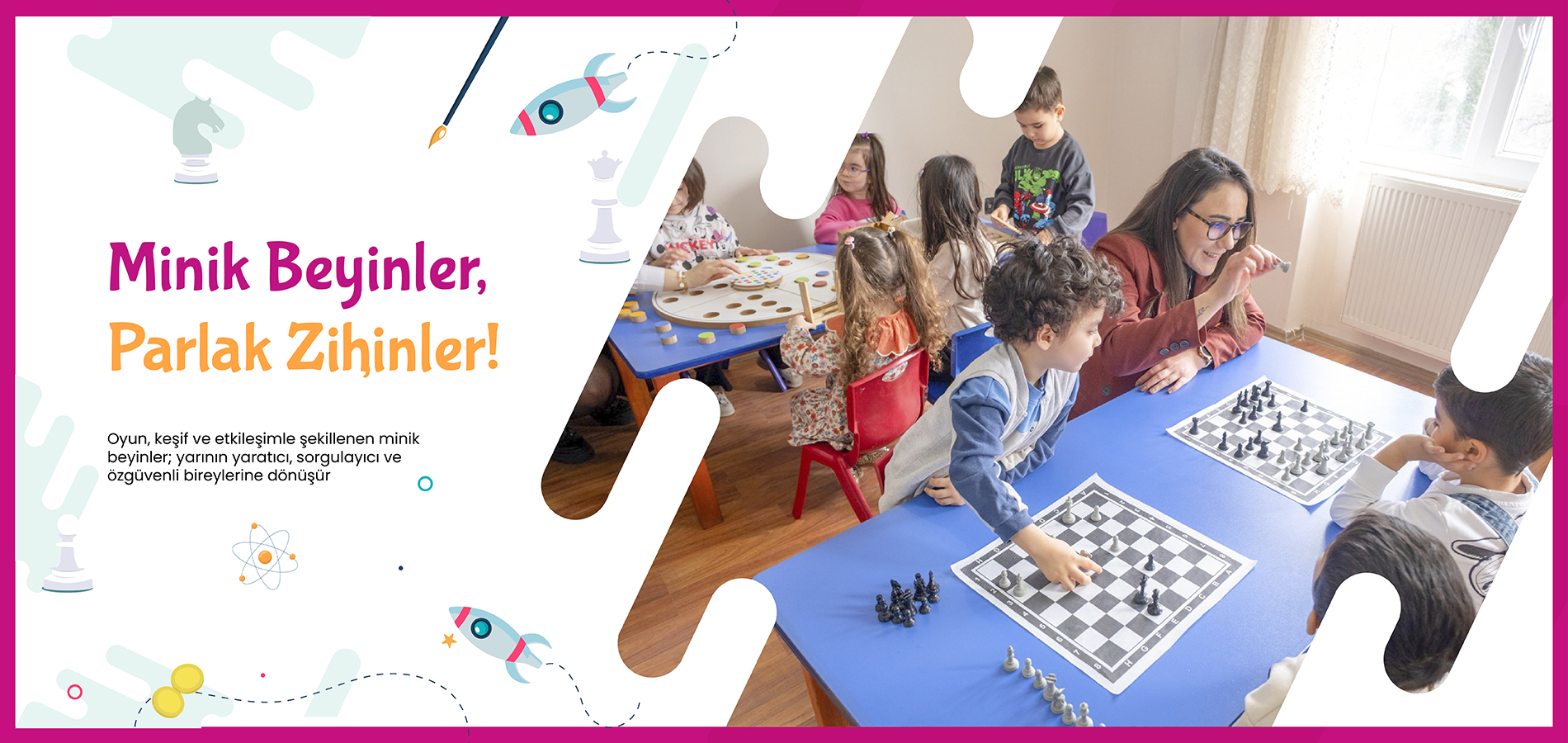 Temel etkinliklerimiz arasında Matematik, Fen ve Doğa, Türkçe ve İngilizce Dil, Sanat, Müzik-Orff, Oyun ve Hareket (Jimnastik ve Fizyoterapi) etkinlikleri yer almaktadır.